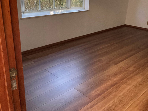 かなり傷んでおり隅の方はクロスがめくれている状態です。これまでのフローリング風クロスと同様の物を張り替えしたところ、すっきりと美しいお部屋に生まれ変わり管理人様からも喜んで頂けました。
